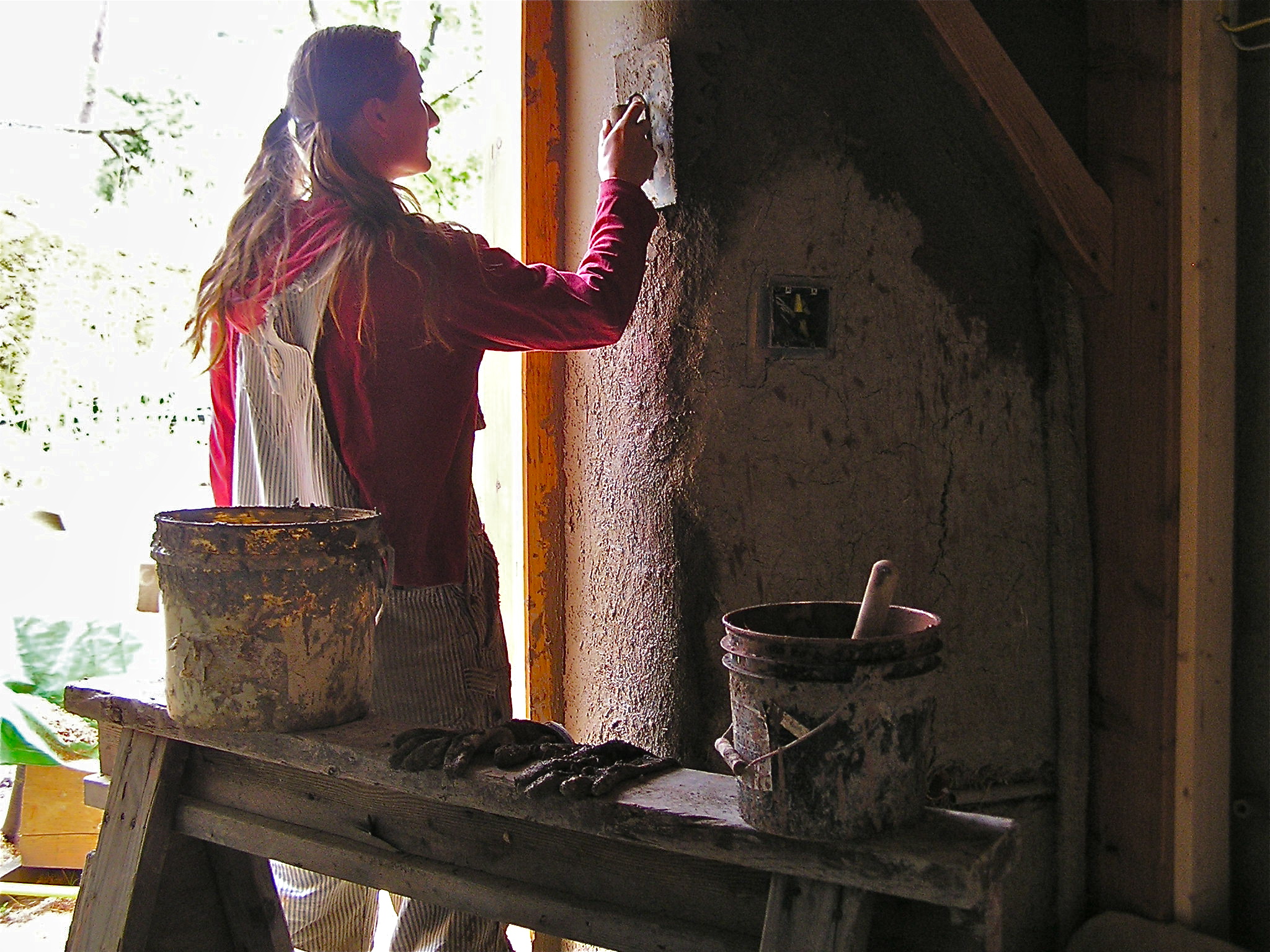 I was much more careful about who I invited to help with this layer- I mostly took it on myself (although Taeven and Cedar both took on their own ways of plastering with the trowel so they could help out).  I had the help of a few friends who are artists (good hand-eye co-ordination) and who helped with the previous layer, so they had an idea of what the result was to be and they came many times to help, building up their experience of working with the plaster.  My own abilities changed so much with this layer as I worked around the house, that I have re-plastered much of the first area I started on, seeing flat spots on window curves and too much cracking in other places.