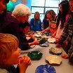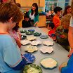 After rolling out a flat piece of circular clay, the kids decorated their clay with a variety of stamping materials, as well as freehand drawing into the clay.  Then Nancy demonstrated a very surprising and delightful way of making the flat clay into a bowl- by laying the slab on a piece of foam, placing a bowl on top of it (there were two sizes to choose from) and pressing down hard into the foam.  When the bowl was released, the clay slab underneath had been pressed into a ripple edged bowl of varying depth.