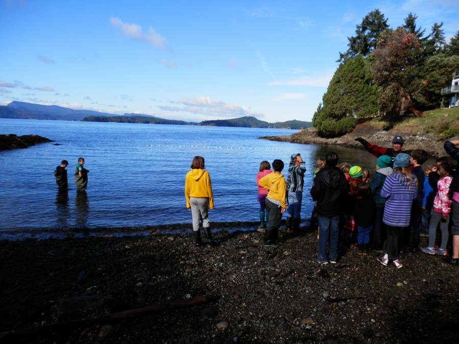 Doug and Jennifer were working with a group of 24 children, from grades 4-8, who are a part of the Pender Ecological Education Community. Doug began the day with some discussion of taxonomy and habitats; the classifications of seaweeds and grasses and the role that the different types have for different fish during the year. The nursery habitats of the eel grass areas have been previously mapped, with help from the Seagrass Conservation Working Group, and are especially worth observing for fish populations throughout the year. I have seen many types of small schools of fish while snorkeling, and the shallow, warmer waters protected by tall forests of the grasses with areas of sandy sea floors seem like the perfect place to hide and feed in relative safety from larger prey.