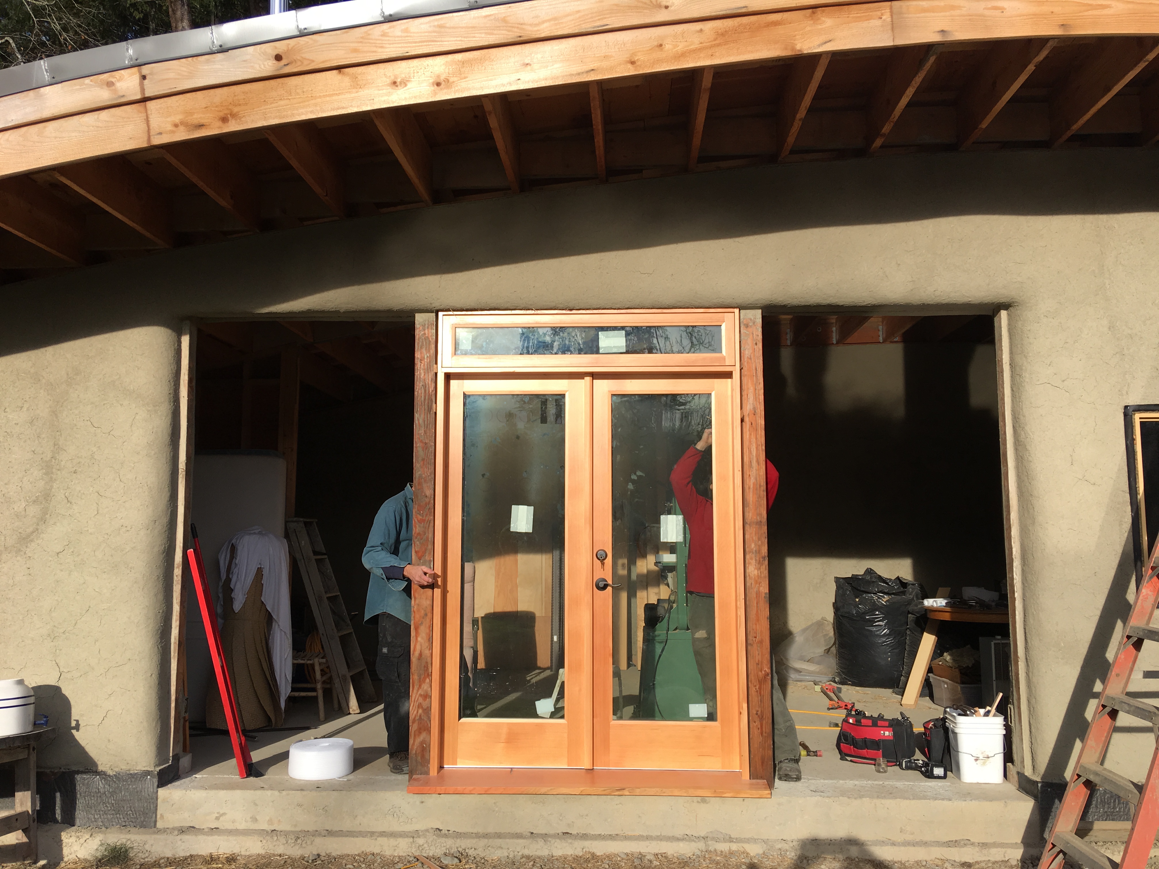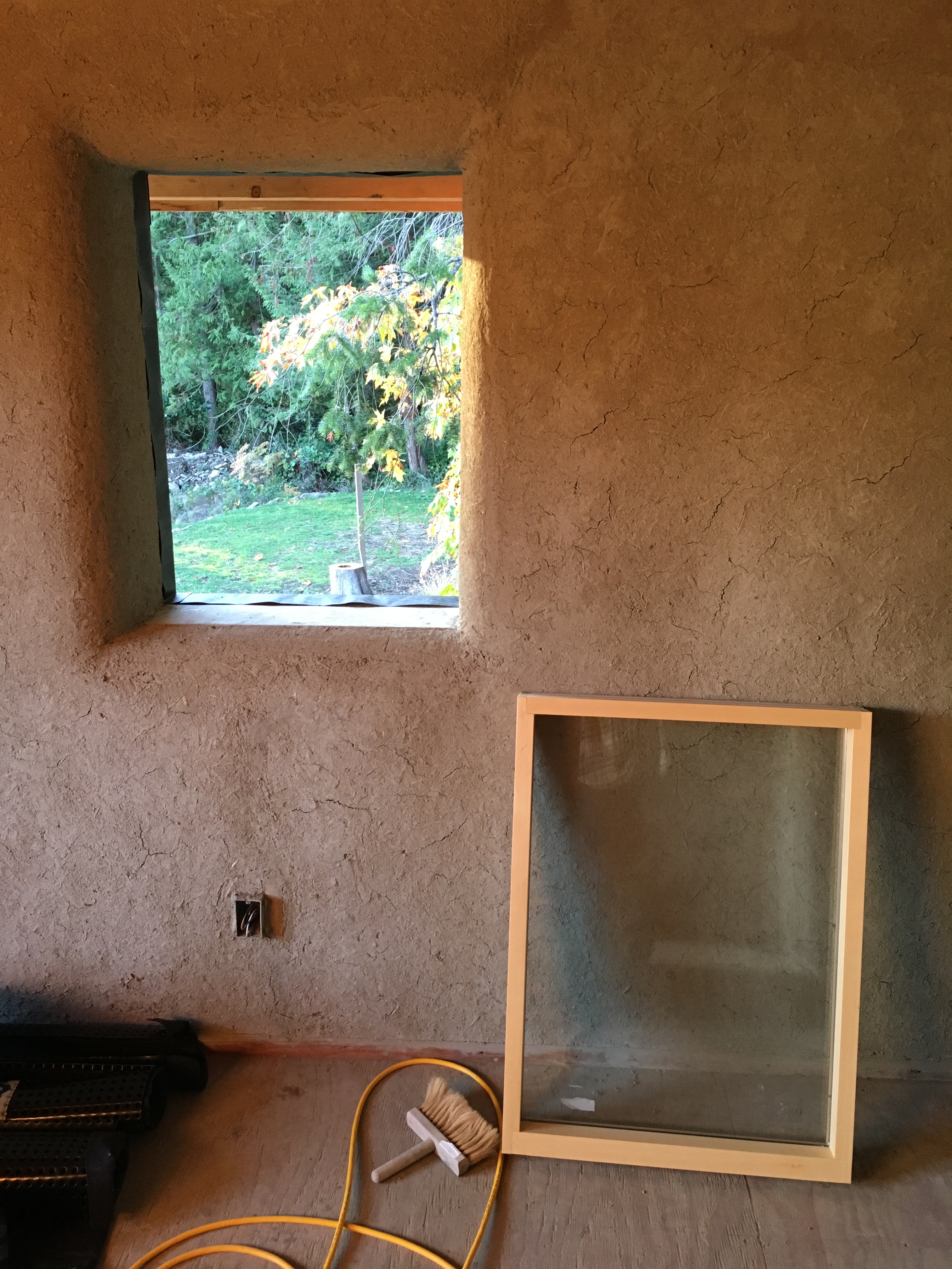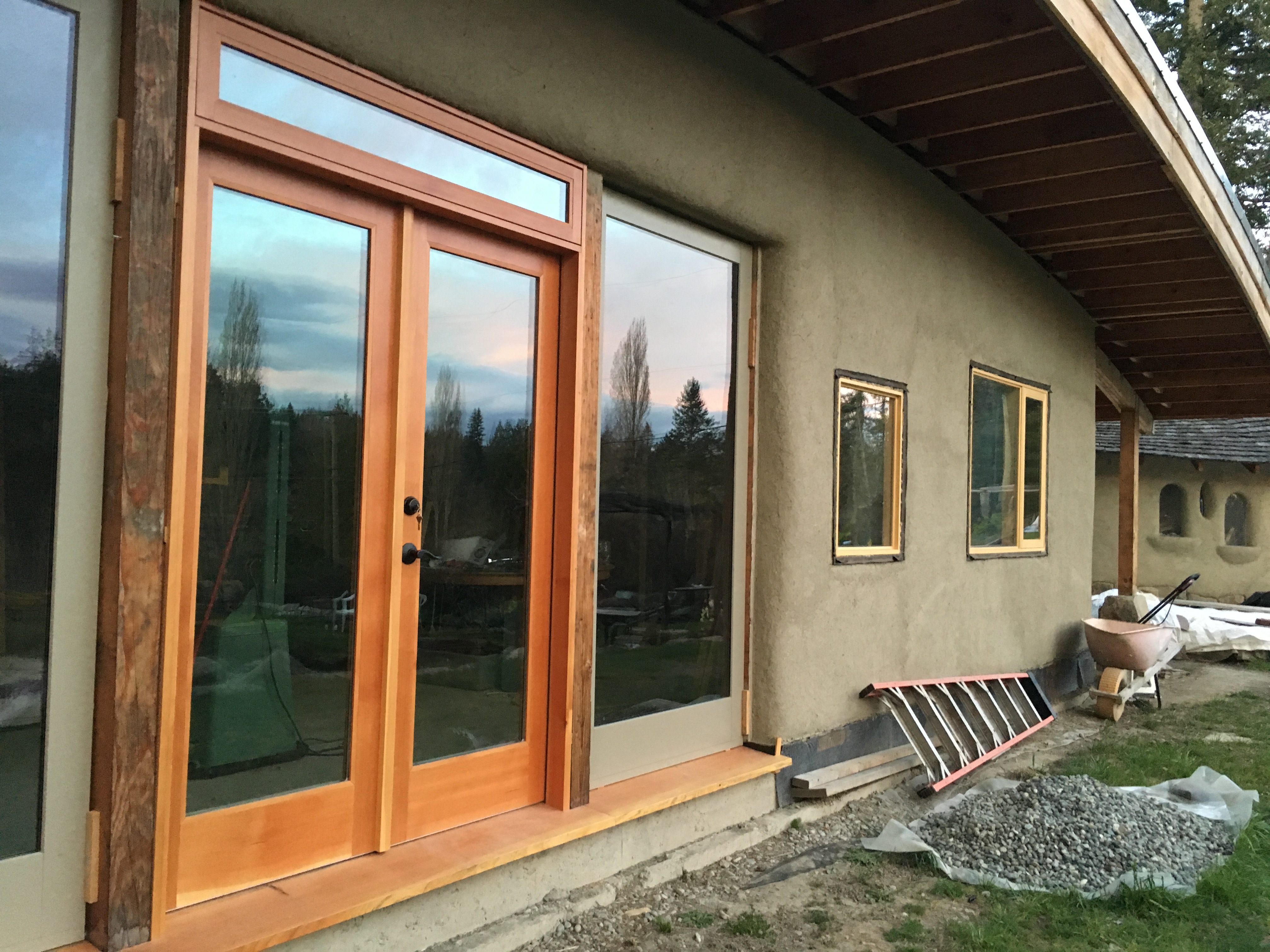 The doors can be more complicated, with wide sills at their feet needing to be installed, catches and locks set in the correct place, weather stripping attached, and the fine art of hanging them upon their hinges can be a painstaking task of patience. However, the details eventually get attended to and the house takes on a completely different feel of shelter- with a clearly defined boundary of inside versus outside.
