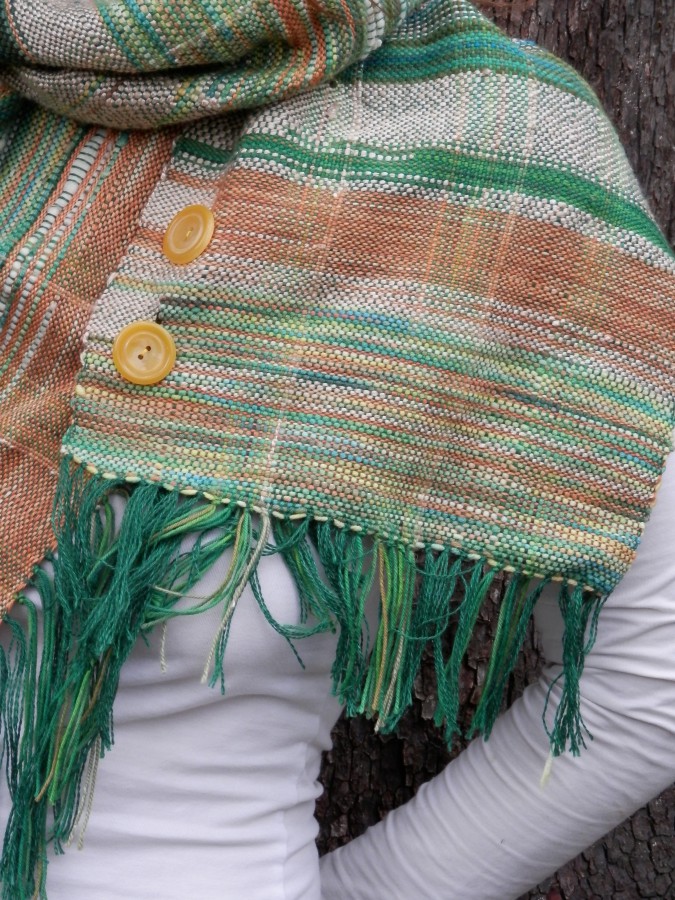 peach scarf buttonsA few more weaving projects have left my loom over the past few months and are ready to be worn in the cooler weather of autumn.  Scarves, of course, are easy to weave and require nothing more than to drape them over oneself.