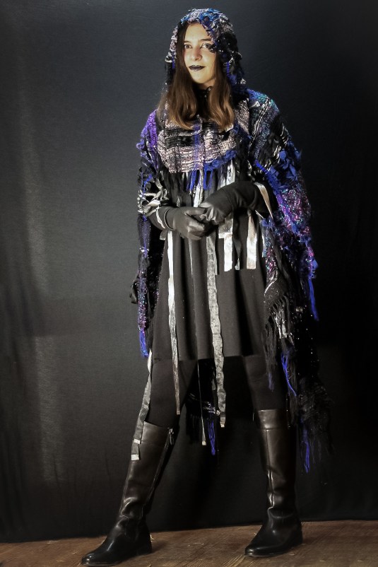 12. Midnight Mantle- originally inspired by folklore images of a woman pulling a blanket of night across the sky, tucking us in for the night, this cloak took on a mystical and timeless realm. Made from recycled silk and cotton dresses ripped into strips.