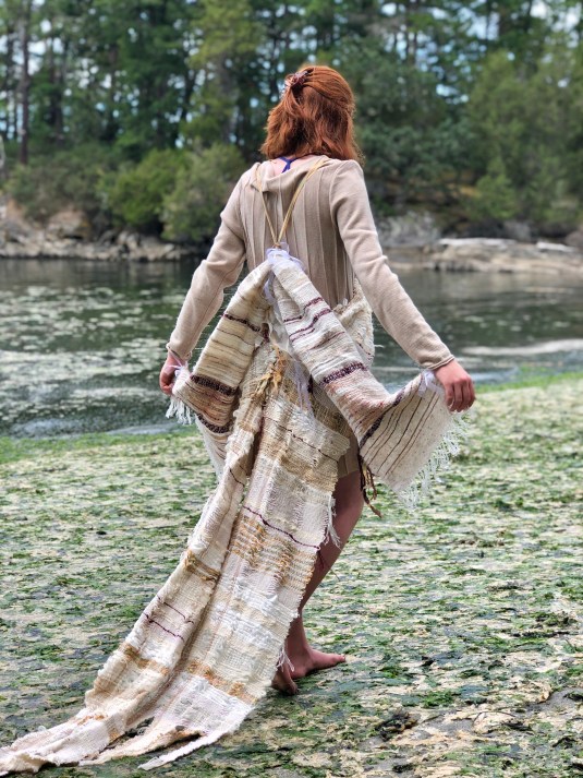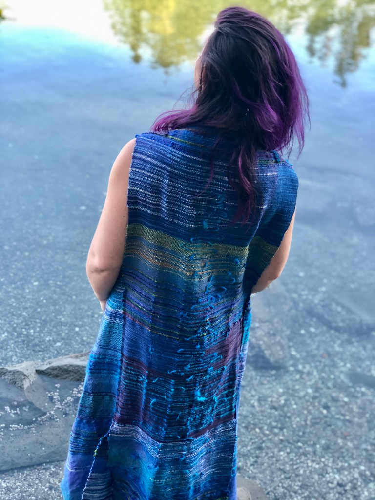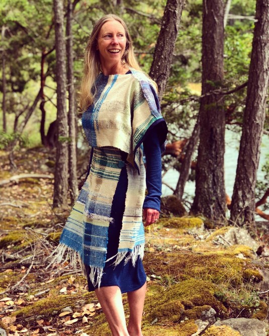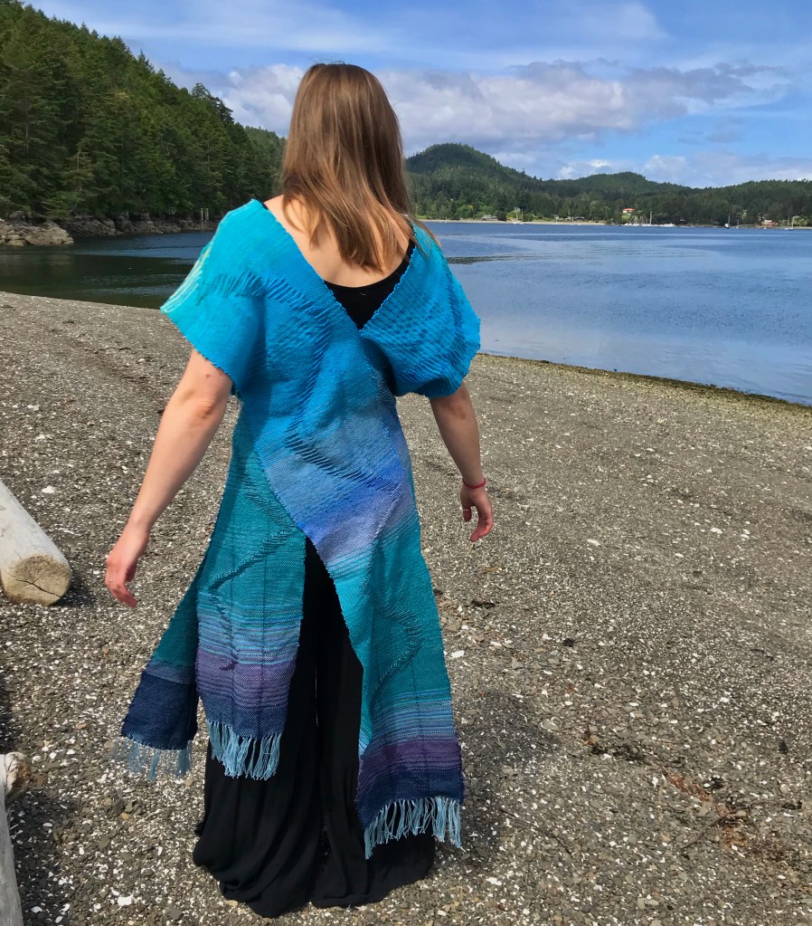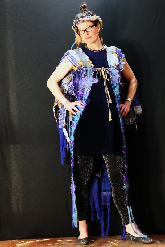 With the second piece, I was looking to make something more with more drape.  I picked up a single, large skein of a fine, almost lace weight merino and wool blend that had long, autumn toned colour changes.  In my buckets, I found two skeins of lace weight alpaca in two shades of green that I hoped would be enough for another wide, long warp.  Without interrupting the weft too much, I added accents and highlights whenever the bobbin and shuttle ran out and there was a slight break in the colour changes.  I had a ball of recycled silk sari yarn, two toned green alpaca, light green roving, blue roving, and some leftover bits of green and orange peace fleece wool from a knitted sweater project.  (Weaving satisfies my need to use up all the little bits of yarn from knitting.  They just can’t be used very easily otherwise!)  I was so happy with the feel and drape that I didn’t want to cut into it at all, and I wanted it to lie flat and simple as a garment  So I folded it once on an angle at the back, letting each side come down straight in the front.  I wove up another section using mostly black linen on the same warp, and added the same accents as in the rest of the piece, and used it across the back, sewing it to the sides and across the back fold of the other piece.  By adding a simple fastener at the front, it can be held together or left open.  For being so light weight, it is so warm!  Thanks to my daughter who took all the modelling photos.  A new role for both of us.