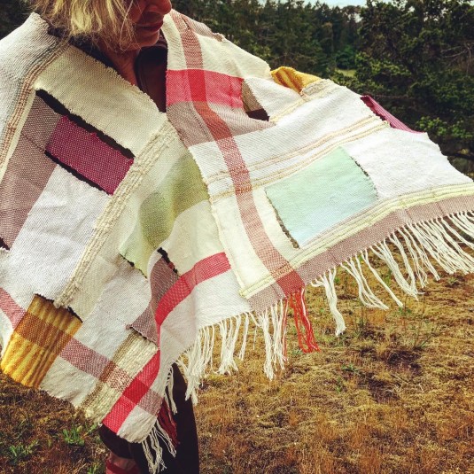 saori autumn weaveThis winter, I finally got the chance to try making some warm winter wearables from a few pieces of weavings I have been producing.  Mostly I have been making scarves, but I really wanted to make a more substantial wrap or jacket.  The widest piece I can make on my Saori loom is 42cm (16.5inches), so I made a warp that was the widest possible and the longest possible from my supplies so that I would not run short.