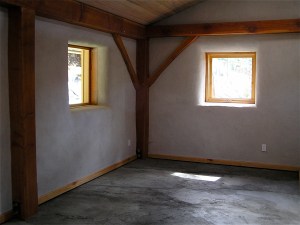 We also have some circular thick glass port windows, about 8 inches across, that we wanted to have in the walls, so we put buckets that were slightly smaller than the glass in the place where we wanted the windows and them cobbed all around them. By turning the buckets each day we ensured that they will pull out easily when we want to set the glass in.