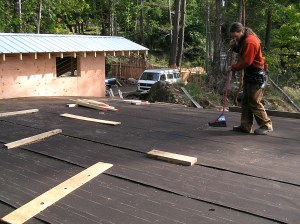 There is no plumbing in the workshop, but there are a few light switches that Colin mounted near the door bucks, running an electrical conduit up to the rafters where all the wiring will run. Other electrical outputs will be built into an interior wall that will frame in a utility room and backing for Colin’s work bench.