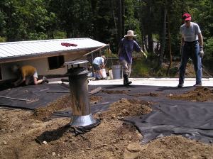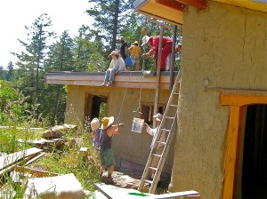 By this time, we were also getting two or three groups of people stopping by every day just to see what was going on, asking questions and watching the process. We are fairly visible to the road, so walkers would stop, cars would slow down, and our neighbor across the street sent anybody who came to see her and her road side stand over to check out our building. After the weekend, Shawn (one of the workshop participants) decided to stay an extra three days and keep cobbing before flying back to South Korea, and we had two more people arriving after that who were not able to make the workshop dates but wanted to learn while we were still getting it finished up. That is where we are now- working up in the top few feet, making deadmen for the rafters to sit on, feeding Marco and Nick alongside our family, and enjoying the continued company of our community.