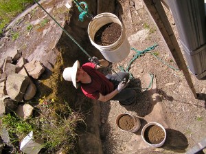 Trimming is a big part of cobbing. Every day, before more cob is loaded on to the walls, the splooges that occur while building up with wet cob is trimmed off with a saw and remixed to be put back on the wall. It is important to make sure that the walls remain plumb, so that the strength of the weight of the cob is kept directly above the foundation. It is easy for the wall edges to wander in all directions. It is also easier to trim excess splooging than it is to add to dips that may occur, so it is important to keep the edges as plumb as possible and allow the splooging to happen.